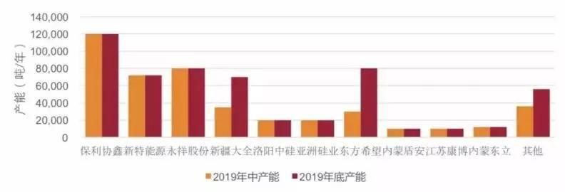 2018年底,全球多晶硅的名義產(chǎn)能為59.8萬噸,其中,國內(nèi)多晶硅企業(yè)的名義產(chǎn)能為38.8萬噸/年,海外產(chǎn)能為21萬噸;2019年上半年,全球多晶硅的名義產(chǎn)能為64.2萬噸,其中國內(nèi)的多晶硅的名義產(chǎn)能為43.3萬噸,海外產(chǎn)能為20.9萬噸,全球多晶硅產(chǎn)業(yè)向中國轉(zhuǎn)移的趨勢越發(fā)明顯。