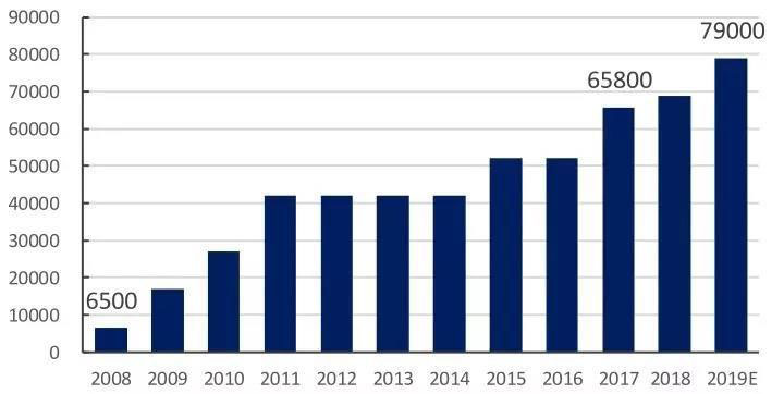 截止到2019年6月底,國內(nèi)多晶硅企業(yè)名義產(chǎn)能超過萬噸級別的有保利協(xié)鑫12萬噸,新特能源7.2萬噸,永祥股份8萬噸,新疆大全3.5萬噸,洛陽中硅2萬噸,亞洲硅業(yè)2萬噸,東方希望3萬噸,內(nèi)蒙盾安1萬噸,江蘇康博1萬噸,內(nèi)蒙東立1.2萬噸,十家產(chǎn)能共計40.9萬噸/年,約占國內(nèi)總產(chǎn)能的94.5%,頭部企業(yè)的市占率在穩(wěn)步提升。預期到2019年年底,國內(nèi)多晶硅產(chǎn)能將達到將達到53.8萬噸/年,主要增量來自下半年大全新能源3.5萬噸產(chǎn)能,東方希望5萬噸產(chǎn)能,天宏瑞科1萬噸產(chǎn)能,其他產(chǎn)能1萬噸的擴產(chǎn)。