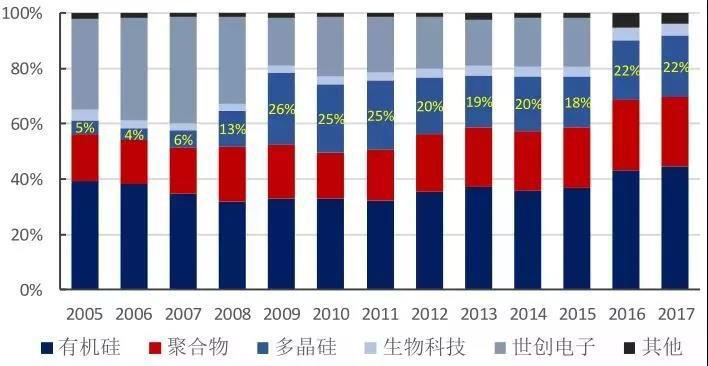瓦克是一家全球運營的化工集團,共有員工約14,500人,年銷售額約達49.8億歐元(2018年)。當前業(yè)務板塊包括有機硅、聚合物、多晶硅和生物科技等,并在有機硅、多晶硅及聚合物板塊中的乳膠粉和VAE共聚乳液等領域占據(jù)全球龍頭地位。近年來多晶硅板塊占公司整體營收的比重在20%左右。