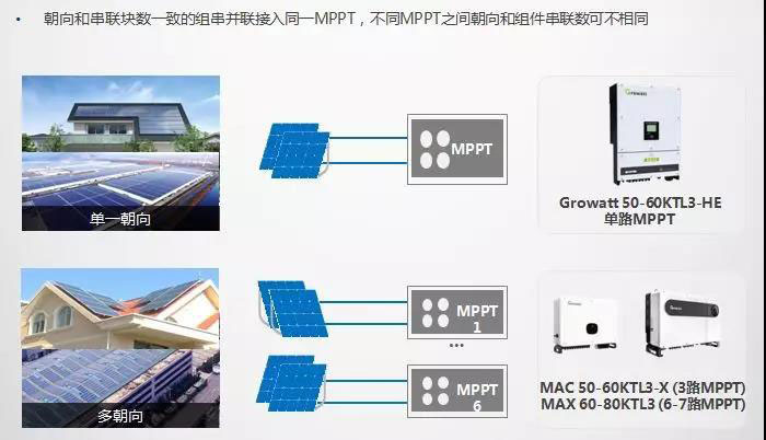 (3)多朝向,多傾角,組串差異較大的情況,建議選擇6-7路MPPT逆變器,可以最大化減少失配損失,提高設計靈活度。