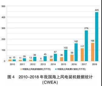 我國海上風電“十三五”以來保持高速發(fā)展,年增長率均保持50%以上。截至2018年底海上風電累計裝機445萬千瓦,其中近海風電累計裝機381萬千瓦,約占裝機總?cè)萘康?6%。自2016年起新增裝機均為近海風電項目,潮間帶項目開發(fā)逐步減少。經(jīng)過近十年的發(fā)展,我國海上風電已經(jīng)擺脫起步階段在潮間帶上的過渡和嘗試,真正意義上的海上風電規(guī)?;_發(fā)初見成效(見圖4)。