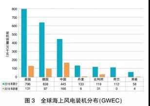 從全球分布來看,歐洲和中國是海上風電發(fā)展的主要市場,合計裝機占比接近全球的98%。2018年歐洲風電發(fā)展出現(xiàn)整體下滑,成為2011年以來風電裝機增長最少的一年,我國海上風電新增裝機首次超過英國和德國,位居全球第一位,進一步縮小了累計裝機差距。全球海上風電新增裝機前三位分別是中國166萬千瓦占比38.2%、英國131萬千瓦占比30.2%和德國97萬千瓦占比22.4%;累計裝機前三位分別是英國796萬千瓦占比34.6%、德國638萬千瓦占比27.7%和中國445萬千瓦占比19.3%(見圖3)。