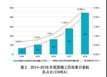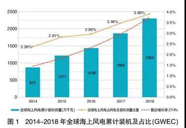 近五年來全球海上風電發(fā)展迅速,復合增長率達到27.4%,占風電裝機總量比重不斷攀升,由2.36%上升至3.89%。我國海上風電發(fā)展速度全球領(lǐng)先,復合增長率達到60.5%,近兩年更是達到72.2%(2017年)和59.5%(2018年),占風電裝機總量比重由0.69%上升至2.42%。