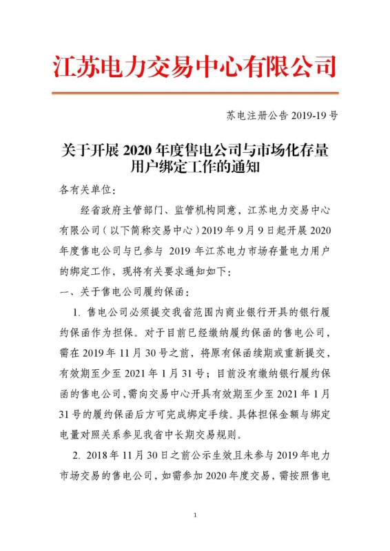關(guān)于開展2020年度售電公司與市場(chǎng)化存量用戶綁定工作的通知