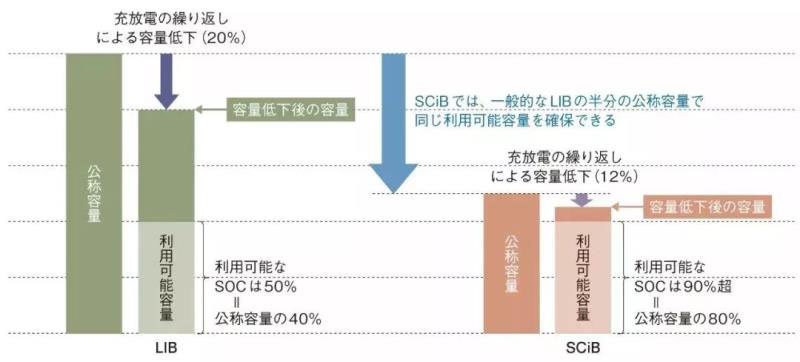 東芝公司的想法是采用鈦酸鋰(LTO)氧化物作為負極的鋰電池“SCiB”。由于SCiB的能量密度低于普通LIB,因此必須堆疊“1.5倍”才能達到相同的容量。