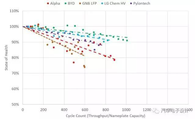 1000次實(shí)驗(yàn):如下圖所示,中國(guó)的Alpha ESS衰減有些快,比亞迪的LFP表現(xiàn)在這個(gè)階段是很不錯(cuò)的。