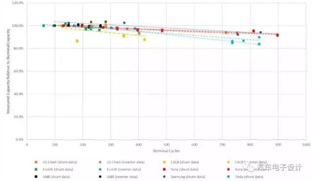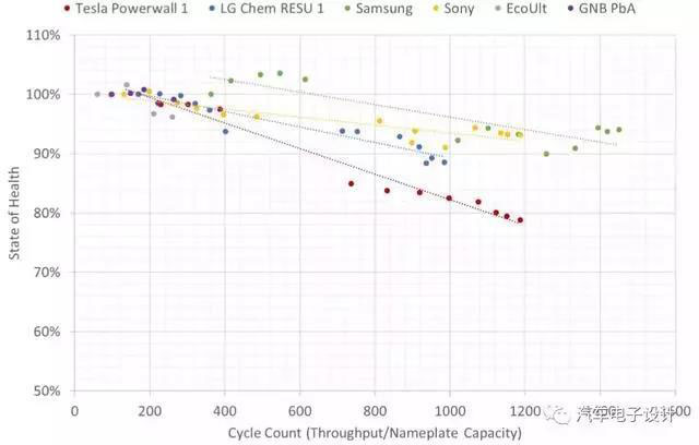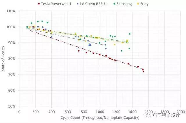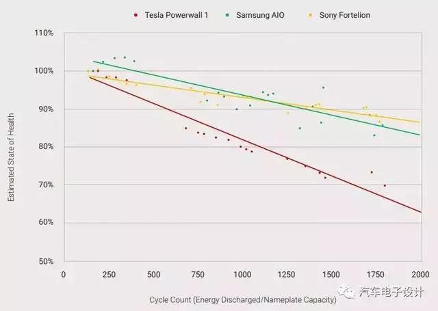 Tesla的電芯,在1750次以后降低到了70%左右,2000次預(yù)估在60%多一些;