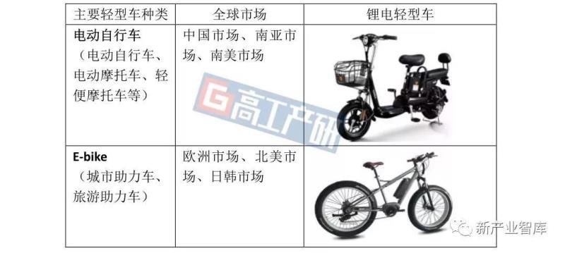 鋰電輕型車(chē)從類(lèi)型上來(lái)劃分,主要有電動(dòng)自行車(chē)、電動(dòng)摩托車(chē)、輕便摩托車(chē)、E-bike,除去南亞和中國(guó)市場(chǎng)以電動(dòng)自行車(chē)、電動(dòng)摩托車(chē)、輕便摩托車(chē)為主要類(lèi)型外,歐洲市場(chǎng)、北美市場(chǎng)以及日韓市場(chǎng)均以E-bike助力車(chē)為主要的鋰電輕型車(chē)。