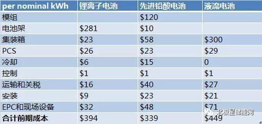 可見雖然液流電池前期一次投入成本較高,但綜合前期建設(shè)、以及全生命周期的運營成本以后,鋰離子電池的單次充電度電成本與液流電池相當,鉛酸電池由于后續(xù)更換電池等因素、單次充電度電成本偏高。