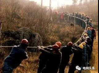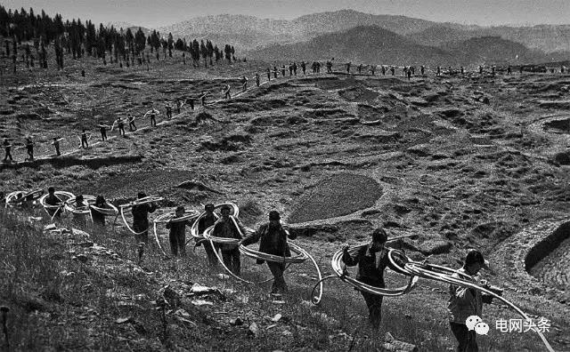 ?上世紀八十年代,我國山區(qū)電力施工架線,一根核桃粗細的輸電導線,需要幾十人乃至上百人用扁擔挑著上山進行施工放線。圖為1982年山東省淄博市博山區(qū)石門鄉(xiāng)龍?zhí)蒙絽^(qū)架線現(xiàn)場。