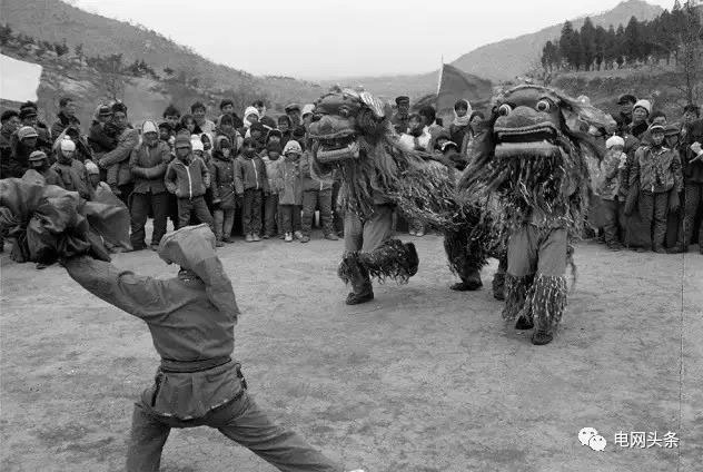 ▲在只有八戶人家的西紅峪小山村,人們敲鑼打鼓舞獅子慶賀村里通電了。