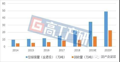 2014-2020年廢舊電池回收量及總報(bào)廢量(單位:萬(wàn)噸)