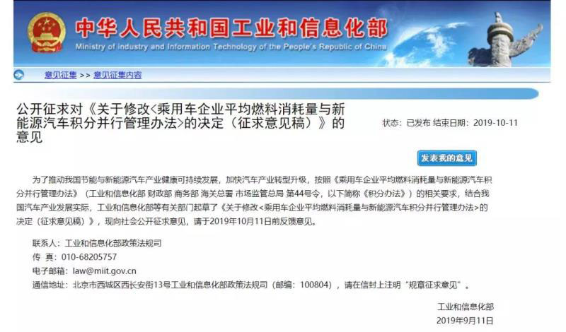 9月11日,工信部等有關(guān)部門公布了《關(guān)于修改<乘用車企業(yè)平均燃料消耗量與新能源汽車積分并行管理辦法>的決定(征求意見稿)》(以下簡稱新版雙積分政策修正案),這一次依舊向社會公開征求意見,并提出請于2019年10月11日前反饋意見。