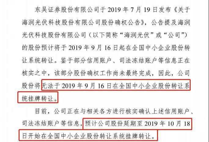 沉寂許久的海潤(rùn)再次引起了行業(yè)的關(guān)注。9月12日,海潤(rùn)光伏在全國(guó)中小企業(yè)股份轉(zhuǎn)讓系統(tǒng)(簡(jiǎn)稱“新三板”)兩網(wǎng)及退市企業(yè)板塊發(fā)布了一則臨時(shí)公告,公告稱:鑒于部分信用賬戶、司法凍結(jié)賬戶等信息正在核實(shí)之中,該部分股份確權(quán)工作尚未最終完成,海潤(rùn)光伏無法于2019年9月16日在新三板掛牌轉(zhuǎn)讓。