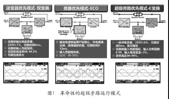 可見逆變器優(yōu)先運(yùn)行模式(雙變換模式)和普通旁路優(yōu)先運(yùn)行模式在可用性方面都有較大的弱點(diǎn)。2012年施耐德研發(fā)團(tuán)隊(duì)研發(fā)出了第三種模式-即超級旁路優(yōu)先運(yùn)行模式(E變換模式)。它不是普通的旁路優(yōu)先模式。如圖1所示,該模式下,逆變器與旁路市電并聯(lián)工作,逆變器精確控制的結(jié)果是最終實(shí)現(xiàn)由旁路市電提供有功功率(基波電流),逆變器提供無功功率(諧波電流),兩者合起來就是IT負(fù)載所需要的電流。因此市電的輸入功率因數(shù)可以做到>0.99,輸入的諧波電流<3%。該模式下UPS提供一級供電質(zhì)量,保證IT設(shè)備的正常運(yùn)行。同時(shí),逆變器還可以給電池提供10%的充電能力。