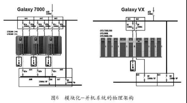 這種系統(tǒng)操作起來是非常復(fù)雜的,因?yàn)閿嗦菲鞣浅6?而且有操作順序的要求。新型的模塊化和類模塊化的UPS供配電系統(tǒng),徹底地改變了這種復(fù)雜狀態(tài)。如圖6所示,一套大功率的模塊化UPS供配電系統(tǒng),每一個(gè)UPS功率柜是250kW,根據(jù)功率的需求,可以用多個(gè)250kW的功率柜進(jìn)行并聯(lián),而且可以共用一個(gè)大功率靜態(tài)旁路柜來提高整個(gè)系統(tǒng)的可用性。我們可以看到在UPS主機(jī)的外圍只需要少量的輸入輸出配電柜和交直流電纜,因?yàn)?50kW的功率柜之間都是采用銅母排進(jìn)行連接的,用銅母排取代了電纜,250kW功率柜的內(nèi)部都有自動(dòng)控制的接觸器,取代了人工操作的外圍的斷路器。