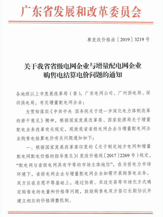 近日廣東省發(fā)改委發(fā)布《關(guān)于我省省級電網(wǎng)企業(yè)與增量配電網(wǎng)企業(yè)購售電結(jié)算電價問題的通知》,通知中稱開展購售電業(yè)務(wù)的雙方應(yīng)在自愿平等的基礎(chǔ)上通過協(xié)商、雙邊交易等市場化方式確定購售電電量和電價,鼓勵購售電雙方簽訂長期協(xié)議并建立相應(yīng)的價格調(diào)整機制。詳情如下: