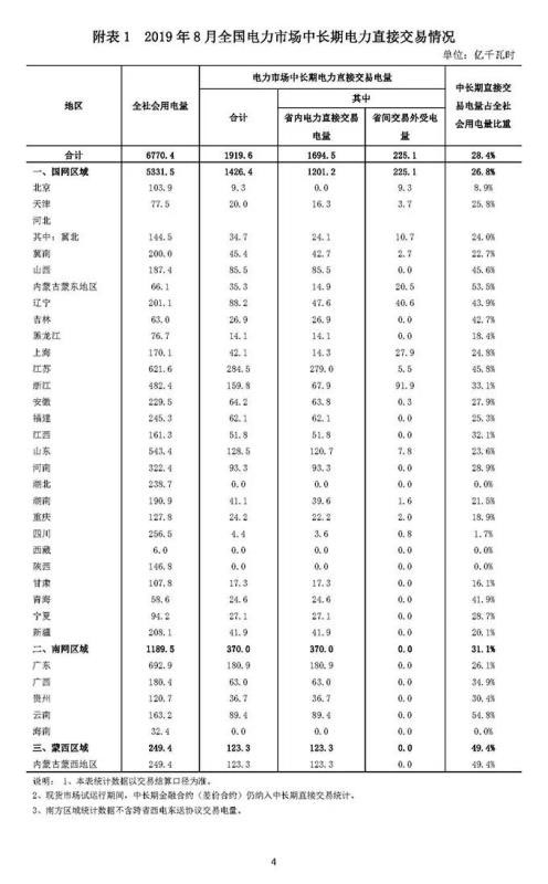 分區(qū)域來(lái)看,國(guó)家電網(wǎng)區(qū)域中長(zhǎng)期電力直接交易電量合計(jì)為9440億千瓦時(shí),占該區(qū)域全社會(huì)用電量的比重為25.2%;南方電網(wǎng)區(qū)域中長(zhǎng)期電力直接交易電量合計(jì)為2628.7億千瓦時(shí),占該區(qū)域全社會(huì)用電量的比重為32.8%;蒙西電網(wǎng)區(qū)域中長(zhǎng)期電力直接交易電量合計(jì)為933.7億千瓦時(shí),占該區(qū)域全社會(huì)用電量的比重為49.3%。