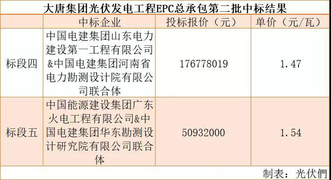 同日,大唐集團(tuán)光伏發(fā)電工程EPC總承包第二批中標(biāo)結(jié)果公示,標(biāo)段四共計(jì)120MW,由中國(guó)電建集團(tuán)山東電力建設(shè)第一工程有限公司&中國(guó)電建集團(tuán)河南省電力勘測(cè)設(shè)計(jì)院有限公司聯(lián)合體以單價(jià)1.47元/瓦中標(biāo);標(biāo)段五共計(jì)33MW,由中國(guó)能源建設(shè)集團(tuán)廣東火電工程有限公司&中國(guó)電建集團(tuán)華東勘測(cè)設(shè)計(jì)研究院有限公司聯(lián)合體以單價(jià)1.54元/瓦中標(biāo)。