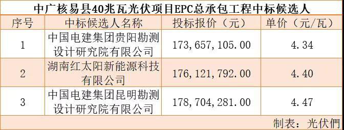 9月20日,中廣核易縣40兆瓦光伏項(xiàng)目EPC總承包工程公示中標(biāo)候選人,中國(guó)電建集團(tuán)貴陽(yáng)勘測(cè)設(shè)計(jì)研究院有限公司以單價(jià)4.34元/瓦成為第一中標(biāo)候選人,具體如下表: