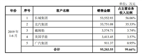 可以說,孚能科技2016年至2018年的第一大客戶當(dāng)屬北汽集團(tuán),2016年、2017年、2018年和2019年1-6月對其銷售收入占主營業(yè)務(wù)收入比重分別為65.63%、87.57%、83.58%和 35.33%,到了2019年上半年,第一大客戶則變?yōu)殚L城集團(tuán),其銷售收入占主營業(yè)務(wù)收入比重為56.06%。由此可見,孚能科技的客戶集中度相對較高,主要是目前產(chǎn)能規(guī)模有限所導(dǎo)致。