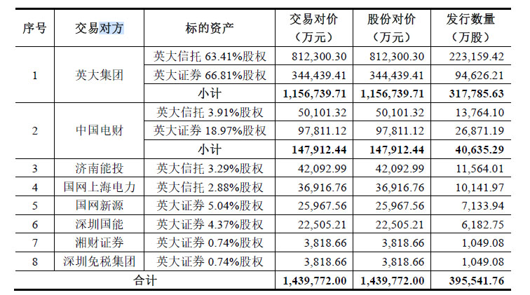 重組草案顯示,公司擬以發(fā)行股份的方式向交易對方購買英大信托73.49%股權(quán)和英大證券96.67%股權(quán),交易作價分別為94.14億元、49.84億元,合計143.98億元。