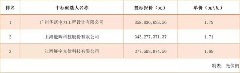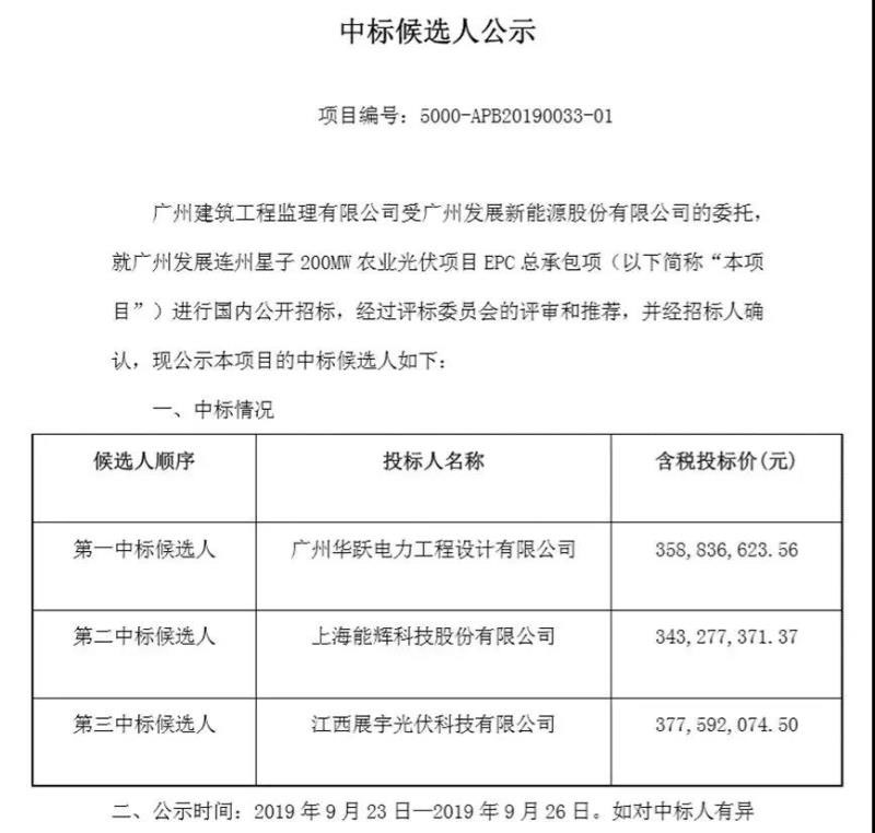 同日,廣州發(fā)展連州星子200MW農(nóng)業(yè)光伏項目公示了EPC總承包中標(biāo)候選人。廣州華躍電力工程設(shè)計有限公司以單價1.79元/瓦位列第一中標(biāo)候選人,詳情如下: