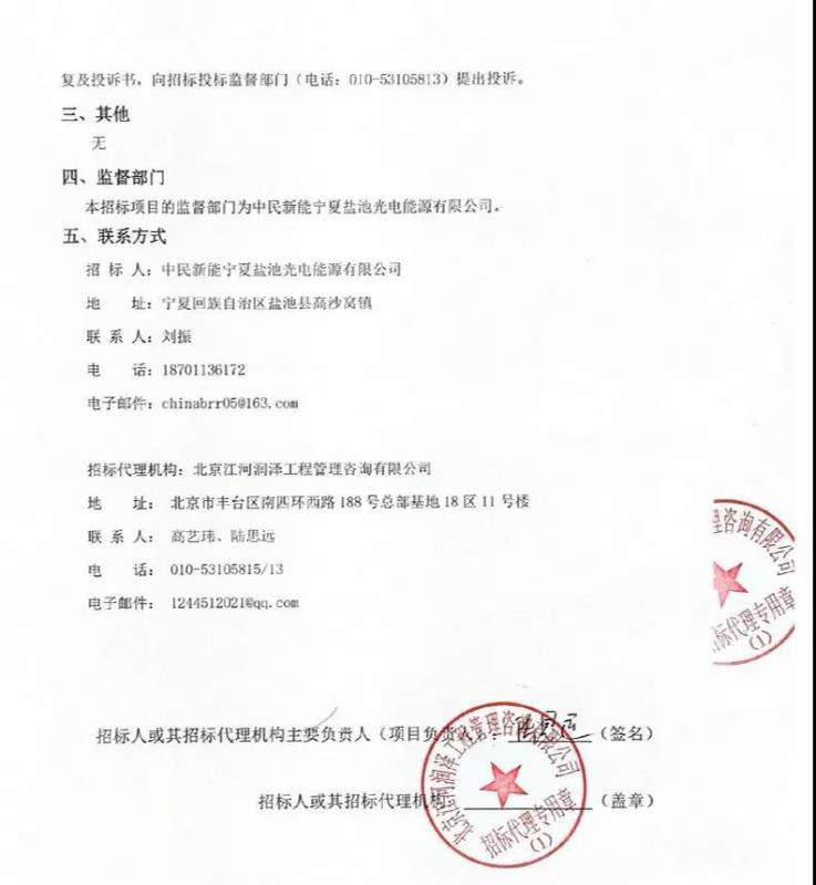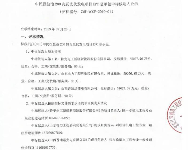 中國儲能網(wǎng)訊:9月23日,中民投鹽池200MW光伏發(fā)電項目公示了EPC總承包中標(biāo)候選人。特變電工新疆新能源股份有限公司以單價2.75元/瓦位列第一中標(biāo)候選人,詳情如下:
