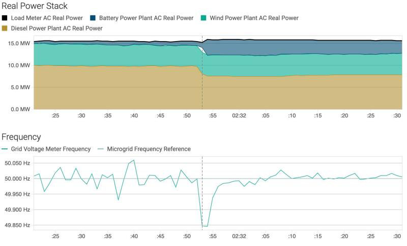 例如,在一個風(fēng)力發(fā)電設(shè)施和儲能系統(tǒng)配套運行的示例中,五個正在運行的風(fēng)力發(fā)電機(jī)的一個突然出現(xiàn)故障,并斷開了與電網(wǎng)的連接。這導(dǎo)致電網(wǎng)頻率急劇下降和電壓下降,其原因是其他正在運行的發(fā)動機(jī)和電池的負(fù)載應(yīng)變突然增加。由于逆變器的快速響應(yīng),儲能系統(tǒng)在這個風(fēng)力發(fā)電機(jī)停機(jī)后立即增加了2.4MW的功率輸出,以彌補(bǔ)損失的發(fā)電量。來自電池儲能系統(tǒng)的快速功率注入還使電網(wǎng)快速穩(wěn)定和恢復(fù)頻率和電壓。因此,儲能系統(tǒng)在穩(wěn)定電網(wǎng)運營中起到了至關(guān)重要的作用。