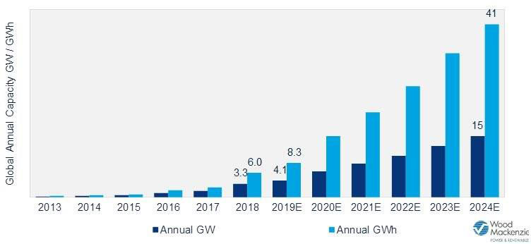 根據(jù)調(diào)研機(jī)構(gòu)Wood Mackenzie Power & Renewables公司的調(diào)查數(shù)據(jù),2018年,全球儲能部署容量同比增長147%,裝機(jī)容量達(dá)到3.3GW,儲能容量達(dá)到6GWh。其增長幾乎是該行業(yè)2013年至2018年74%復(fù)合年平均增長率的兩倍。Wood Mackenzie儲能研究負(fù)責(zé)人Ravi Manghani在今年4月發(fā)表調(diào)查結(jié)果時表示,去年的部署儲能容量量占到過去五年部署儲能總?cè)萘康囊话胍陨希@表明全球儲能部署需求呈上升趨勢。