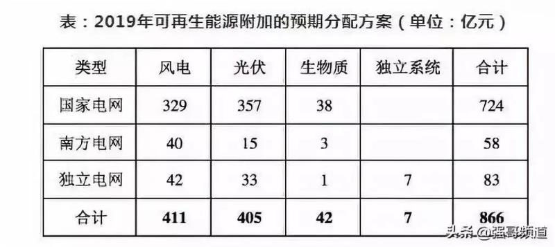 此前,據(jù)“國家可再生能源信息管理中心”的信息,2019年預期能收上來的866億元補貼,預期分配給光伏、風電、生物質(zhì)、獨立系統(tǒng)的補貼額度分別為411億元、405億元、42億元和7億元,共計866億元。其中,預期分配給國家電網(wǎng)的補貼額度最高為724億元,預期分配給南方電網(wǎng)和獨立電網(wǎng)的補貼分別為58億元和83億元。