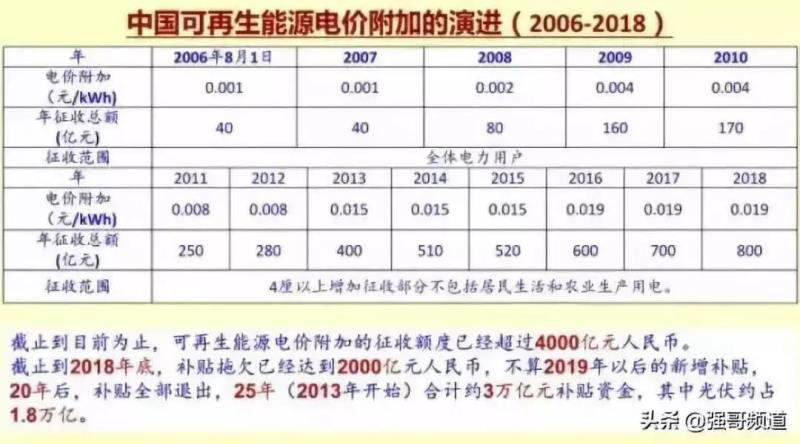 國家發(fā)改委能源研究所研究員王斯成測算,目前我國可再生能源電價附加的征收額度已超過4000億元人民幣。截至2018年底,補貼拖欠已達到2000億元人民幣,不包括2019年以后的新增補貼。20年后,補貼全部退出,從2013年算起25年合計約3萬億元補貼資金,其中光伏約占1.8萬億元。