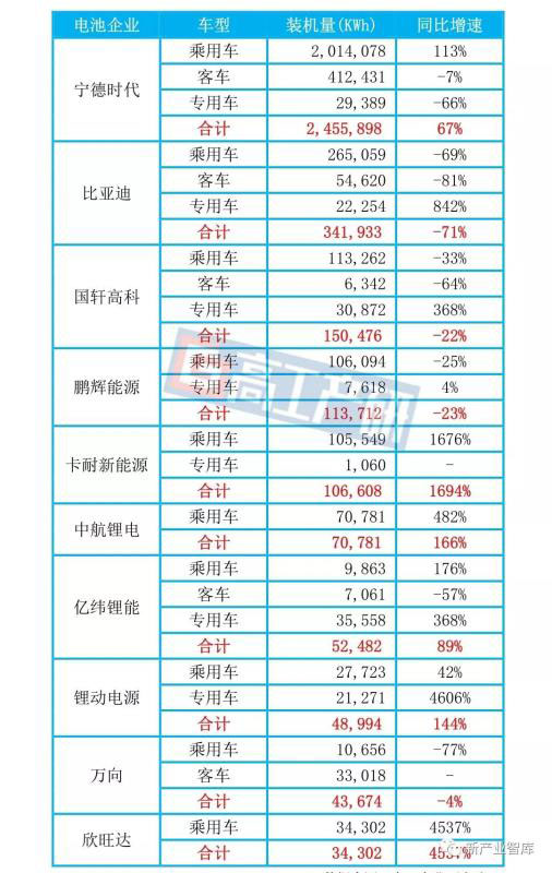 其四:動力電池裝機量TOP10企業(yè)同比增速喜憂參半。排名前十企業(yè)中,比亞迪、國軒高科、鵬輝能源、萬向四家企業(yè)同比增速為負,分別為-71%、-22%、-23%、-4%;而寧德時代、卡耐新能源、中航鋰電、億緯鋰能、鋰動電源、欣旺達同比增速為正。其中,卡耐新能源、欣旺達同比增速超出10倍之上,分別為1694%、4537%。