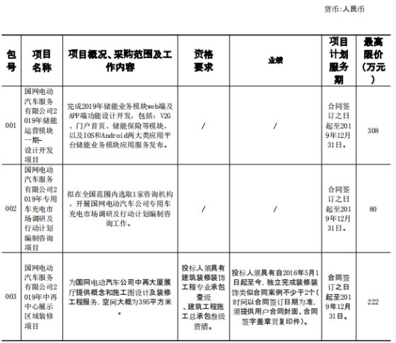 中國(guó)儲(chǔ)能網(wǎng)訊:國(guó)網(wǎng)電動(dòng)汽車服務(wù)有限公司2019年第九批服務(wù)招標(biāo)采購(gòu)項(xiàng)目進(jìn)行招標(biāo)。內(nèi)容包括國(guó)網(wǎng)電動(dòng)汽車服務(wù)有限公司2019年儲(chǔ)能運(yùn)營(yíng)模塊一期-設(shè)計(jì)開發(fā)項(xiàng)目擬采購(gòu)?fù)瓿?019年儲(chǔ)能業(yè)務(wù)模塊web端及APP端功能設(shè)計(jì)開發(fā),包括:儲(chǔ)能V2G功能、門戶首頁(yè)、儲(chǔ)能保險(xiǎn)等模塊,以及IOS和Android兩大類應(yīng)用平臺(tái)儲(chǔ)能業(yè)務(wù)模塊應(yīng)用服務(wù)發(fā)布;國(guó)網(wǎng)電動(dòng)汽車服務(wù)有限公司2019年專用車充電市場(chǎng)調(diào)研及行動(dòng)計(jì)劃編制咨詢項(xiàng)目擬在全國(guó)范圍內(nèi)選取1家咨詢機(jī)構(gòu),開展國(guó)網(wǎng)電動(dòng)汽車公司專用車充電市場(chǎng)調(diào)研及行動(dòng)計(jì)劃編制咨詢工作等。詳情如下: