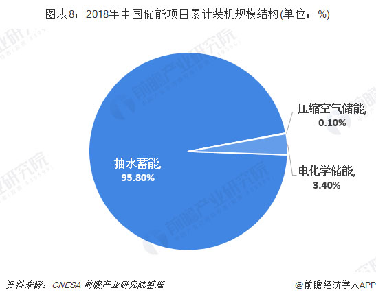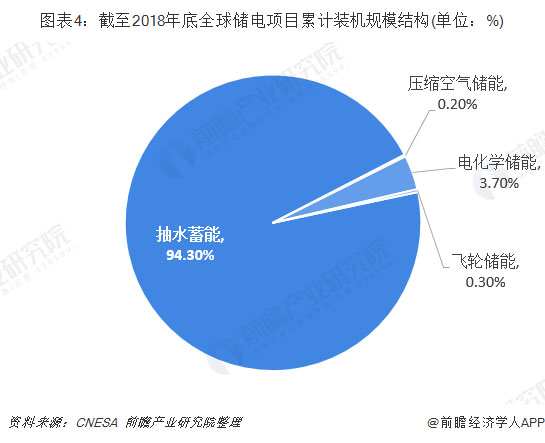 根據(jù)CNESA全球儲能項(xiàng)目庫的不完全統(tǒng)計(jì),截至2018年底,抽水蓄能的累計(jì)裝機(jī)規(guī)模占儲電項(xiàng)目累計(jì)裝機(jī)容量的95.74%。