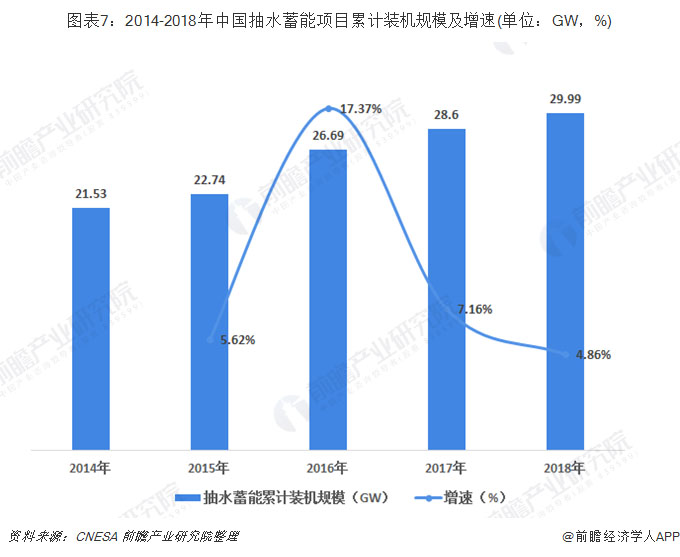 2014-2018年我國抽水蓄能市場規(guī)模不斷擴(kuò)大。根據(jù)CNESA全球儲能項(xiàng)目庫的不完全統(tǒng)計(jì),截至2018年底,中國已投運(yùn)儲能項(xiàng)目累計(jì)裝機(jī)規(guī)模31.3GW,其中抽水蓄能的累計(jì)裝機(jī)規(guī)模最大,為29.99GW,同比增長4.86%,占全國儲能裝機(jī)總規(guī)模的96%。