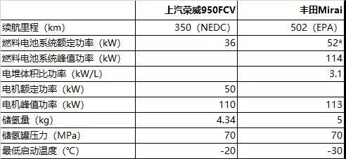 在燃料汽車核心技術(shù)方面,中國與國際先進(jìn)水平有多大差距?這部分我們通過整車的性能參數(shù)來進(jìn)行對比。選取的對比車型上汽榮威950FCV和豐田Mirai。