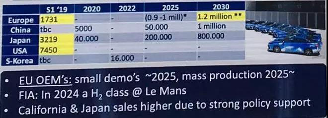 從銷量來看,美國最多,截止今年第一季度達(dá)到7450輛,日本次之,也有3219輛,歐洲氫燃料電池汽車銷量是1731輛(中國和韓國數(shù)據(jù)待確認(rèn))。如果按照李駿的數(shù)據(jù),中國與日本的銷量規(guī)模差不多。