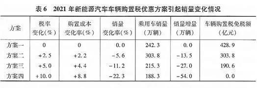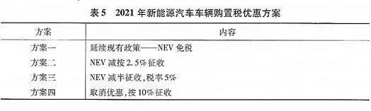 本部分選取2021年新能源汽車(chē)車(chē)輛購(gòu)置稅方案進(jìn)行分析。為避免政策突然停止導(dǎo)致對(duì)市場(chǎng)影響過(guò)大,政策退出應(yīng)分階段分步驟。具體可采用兩種方式,一是大幅提升技術(shù)要求,減少滿(mǎn)足免稅要求的車(chē)型數(shù)量;二是由免稅轉(zhuǎn)為減稅,降低優(yōu)惠幅度。其中針對(duì)稅率調(diào)整提出以下具體方案,如表5所示。