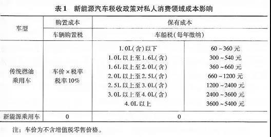 目前,我國(guó)已初步建立涉及新能源汽車(chē)研發(fā)、生產(chǎn)、購(gòu)置、保有及使用階段的稅收支持政策。其中,消費(fèi)者可直接享受的政策有車(chē)輛購(gòu)置稅和車(chē)船稅優(yōu)惠政策,這兩項(xiàng)政策可直接降低消費(fèi)者購(gòu)置及保有成本。具體成本差異如表1所示。