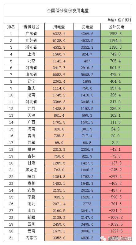 從各?。ㄊ校┌l(fā)用電量看,電力資源分布與需求呈逆向分布特征明顯,2018年各省區(qū)外受電量總和8723億千瓦時(shí),占當(dāng)?shù)乜偘l(fā)電量20.4%。廣東、江蘇、山東省用電量位居前三,山東、江蘇、內(nèi)蒙古發(fā)電量位居前三,廣東、江蘇、浙江省區(qū)外受電量位居前三,北京、上海、重慶區(qū)外受電占用電量的比重位居前三。