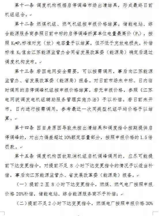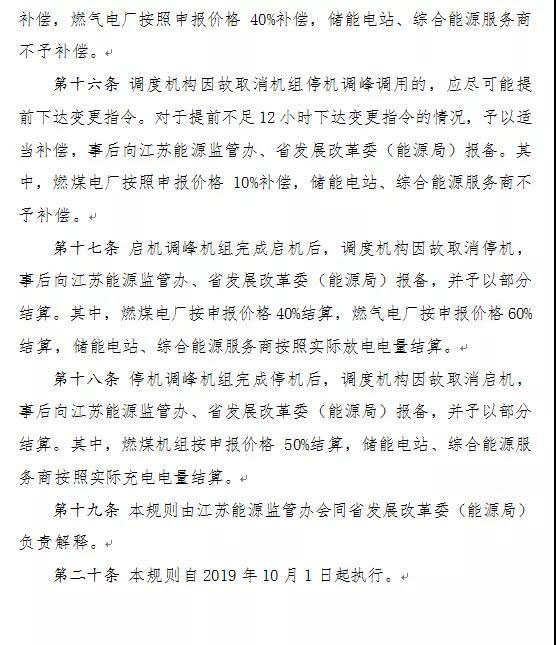為進(jìn)一步完善江蘇電力輔助服務(wù)補(bǔ)償機(jī)制,促進(jìn)調(diào)峰資源優(yōu)化配置,決定自2019年10月1日起:深度調(diào)峰市場40%以下負(fù)荷段最高限價調(diào)高至1000元/兆瓦時;參與輔助服務(wù)補(bǔ)償費用分?jǐn)偟惶峁┱{(diào)峰和調(diào)頻輔助服務(wù)的發(fā)電企業(yè),調(diào)整為按平均運行容量2倍分?jǐn)傒o助服務(wù)補(bǔ)償費用。