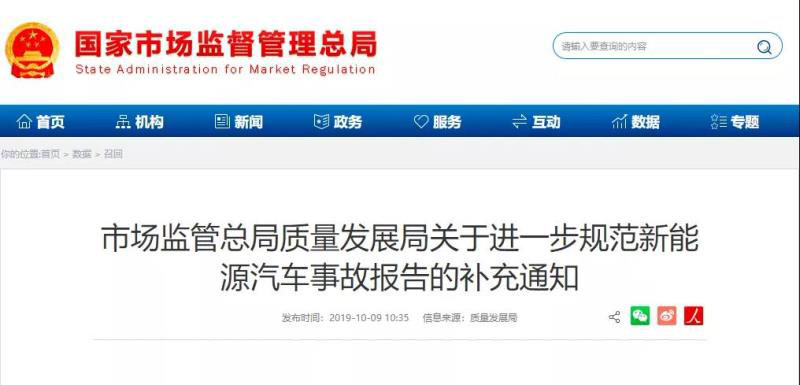 根據(jù)《市場監(jiān)管總局辦公廳關(guān)于進(jìn)一步加強新能源汽車產(chǎn)品召回管理的通知》(市監(jiān)質(zhì)函〔2019〕531號),為強化新能源汽車產(chǎn)品安全召回監(jiān)管,進(jìn)一步規(guī)范新能源汽車事故報告制度,現(xiàn)補充通知如下: