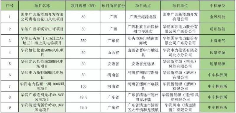 中國(guó)儲(chǔ)能網(wǎng)訊:近日,國(guó)電貴港白花山風(fēng)電項(xiàng)目、華能廣西岑溪青山坪項(xiàng)目、華能汕頭海門(場(chǎng)址二、場(chǎng)址三)海上風(fēng)電場(chǎng)項(xiàng)目等9個(gè)風(fēng)電項(xiàng)目開標(biāo),規(guī)模共計(jì)1009.7MW,中標(biāo)企業(yè)分別是:金風(fēng)科技(80MW)、遠(yuǎn)景能源(80MW)、明陽(yáng)智能(50MW)、上海電氣(550MW)、中車株洲所(249.7MW),中標(biāo)總價(jià)超58億元。