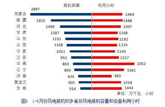 分類型看,1-8月份,全國水電設(shè)備平均利用小時(shí)為2538小時(shí),比上年同期增加200小時(shí)。在水電裝機(jī)容量排前10的省份中,除湖北外,其他省份水電設(shè)備平均利用小時(shí)均同比增加,其中,福建、湖南、浙江和廣東同比增加超過500小時(shí),分別增加1331、983、624和508小時(shí);全國火電設(shè)備平均利用小時(shí)為2831小時(shí)(其中,燃煤發(fā)電和燃?xì)獍l(fā)電設(shè)備平均利用小時(shí)分別為2910和1762小時(shí)),比上年同期降低107小時(shí)。分省份看,全國共有12個(gè)省份火電設(shè)備利用小時(shí)超過全國平均水平,其中內(nèi)蒙古、河北、江西、安徽和海南超過3200小時(shí),而云南和西藏僅為1009和189小時(shí)。與上年同期相比,共有20個(gè)省份火電利用小時(shí)同比降低,其中廣東、天津、福建、湖南、青海和浙江同比降低超過300小時(shí),分別降低469、425、401、361、355和308小時(shí),上海、江蘇、云南、河南、江西和遼寧降低超過200小時(shí),而廣西和四川分別增加385和355小時(shí),新疆和湖北增加超過200小時(shí);全國核電設(shè)備平均利用小時(shí)4844小時(shí),比上年同期降低96小時(shí);全國并網(wǎng)風(fēng)電設(shè)備平均利用小時(shí)1388小時(shí),比上年同期降低24小時(shí);全國太陽能發(fā)電設(shè)備平均利用小時(shí)895小時(shí),比上年同期增加43小時(shí)。