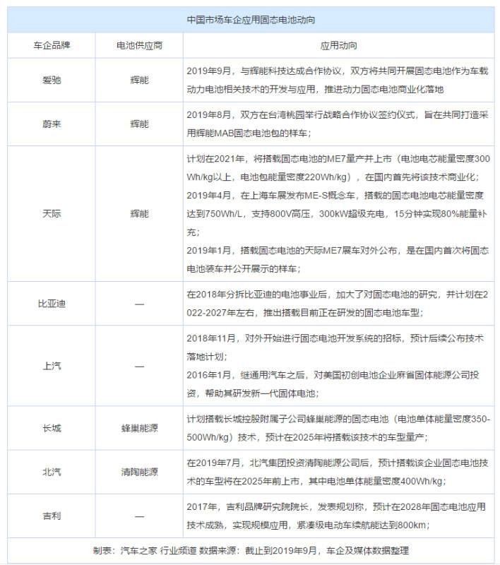 具體車企來看,在固態(tài)電池應(yīng)用前期,新興造車品牌是主力,通過“背靠大樹”,以與國內(nèi)實(shí)力較強(qiáng)的固態(tài)電池供應(yīng)商合作方式,搶占了市場先機(jī)。其中,以規(guī)劃進(jìn)程最快是天際汽車,在2019年初,便發(fā)布了國內(nèi)首款應(yīng)用固態(tài)電池的試裝車ME7,搭載的輝能電池能量密度達(dá)到300Wh/kg,電池包能量密度達(dá)到220Wh/kg,并計(jì)劃在2021年進(jìn)行批量生產(chǎn)及上市。而同年,蔚來和愛馳也緊隨其后,宣布與輝能合作,開始著手應(yīng)用車載固態(tài)電池技術(shù)。