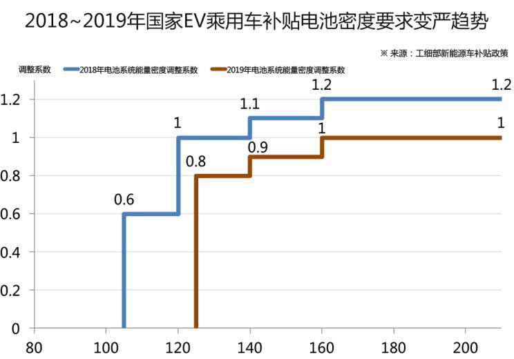 近三年來,新能源車補(bǔ)貼標(biāo)準(zhǔn)嚴(yán)格化趨勢就是最好的例證。自2017年開始,在純電動車補(bǔ)貼標(biāo)準(zhǔn)將電池能量密度納入考量后,2018年及2019年繼續(xù)對電池能量密度的準(zhǔn)入門檻及要求水平提出嚴(yán)苛限制(目前國家補(bǔ)貼金額=標(biāo)準(zhǔn)補(bǔ)貼額*電池能量密度加權(quán)值*電池能耗率系數(shù)),倒逼車企電池進(jìn)行技術(shù)升級。