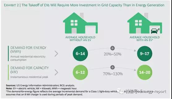 那么需要擴大多少?特別是在住宅領(lǐng)域,增加一個可以在4~6小時內(nèi)為一輛電動汽車充電的充電器,將使普通家庭的用電量增加20~50%。然而,當(dāng)你考慮到這種增加的消耗將在一天中分散開來時,整個系統(tǒng)(包括商業(yè)、工業(yè)和其他部門)所需的增加的能源生產(chǎn)能力并不大。相比之下,對普通家庭來說,電動汽車充電將需要更大的增長—70~130%的電網(wǎng)容量。(見附表2)。這一需求的增長大致相當(dāng)于該地區(qū)新增了一套全新住宅。