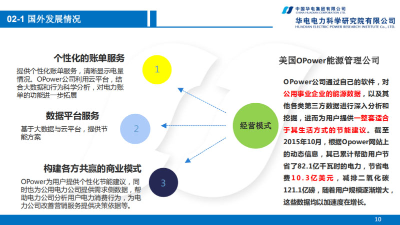 美國綜合能源方面,他們不僅僅是現(xiàn)在的分布式能源,美國現(xiàn)在電力市場比較靈活,當然他們還有一些節(jié)能服務的綜合能源公司,像美國的OPower是典型的節(jié)能公司,他們建立了信息化的能耗平臺,給用戶進行節(jié)能的建議和效益的提升。