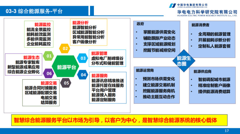 在能源的服務平臺方面,服務是綜合平臺系統(tǒng)的核心,也是按照市場為導向、客戶為中心建設,借鑒能源互聯(lián)網平臺的理念,形成開放式的協(xié)作和服務體系,這是綜合能源服務很有價值的地方。服務平臺可以對能源的監(jiān)控、分析、管理、服務、交易等,通過對政府能源服務商、供應商和能源的運營商構建生態(tài)的能源系統(tǒng),在平臺里面可以進行很好的耦合和資源的共享。
